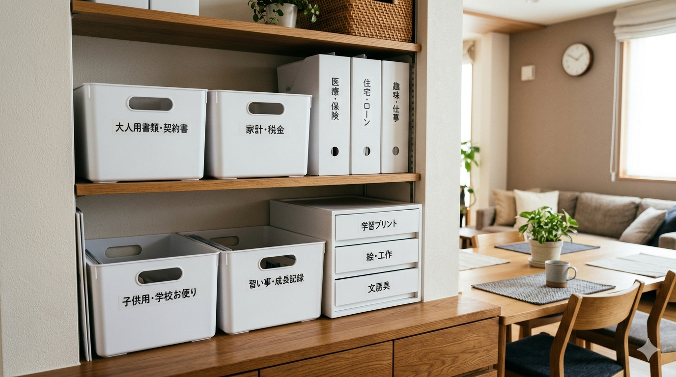 これらの基本ルールを押さえることで、書類収納は格段にスムーズになります。次のブロックでは、大人用と子供用に分けた具体的な収納術について詳しく紹介します。